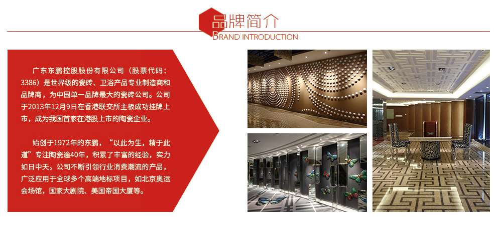 廣東東鵬控股股份有限公司(股票代碼:3386)是世界級的瓷磚、衛浴產(chǎn)品專(zhuān)業(yè)制造商和品牌商,為中國單一品牌最大的瓷磚公司。公司于2013年12月9日在香港聯(lián)交所主板成功掛牌上市,成為我國首家在港股上市的陶瓷企業(yè)。
